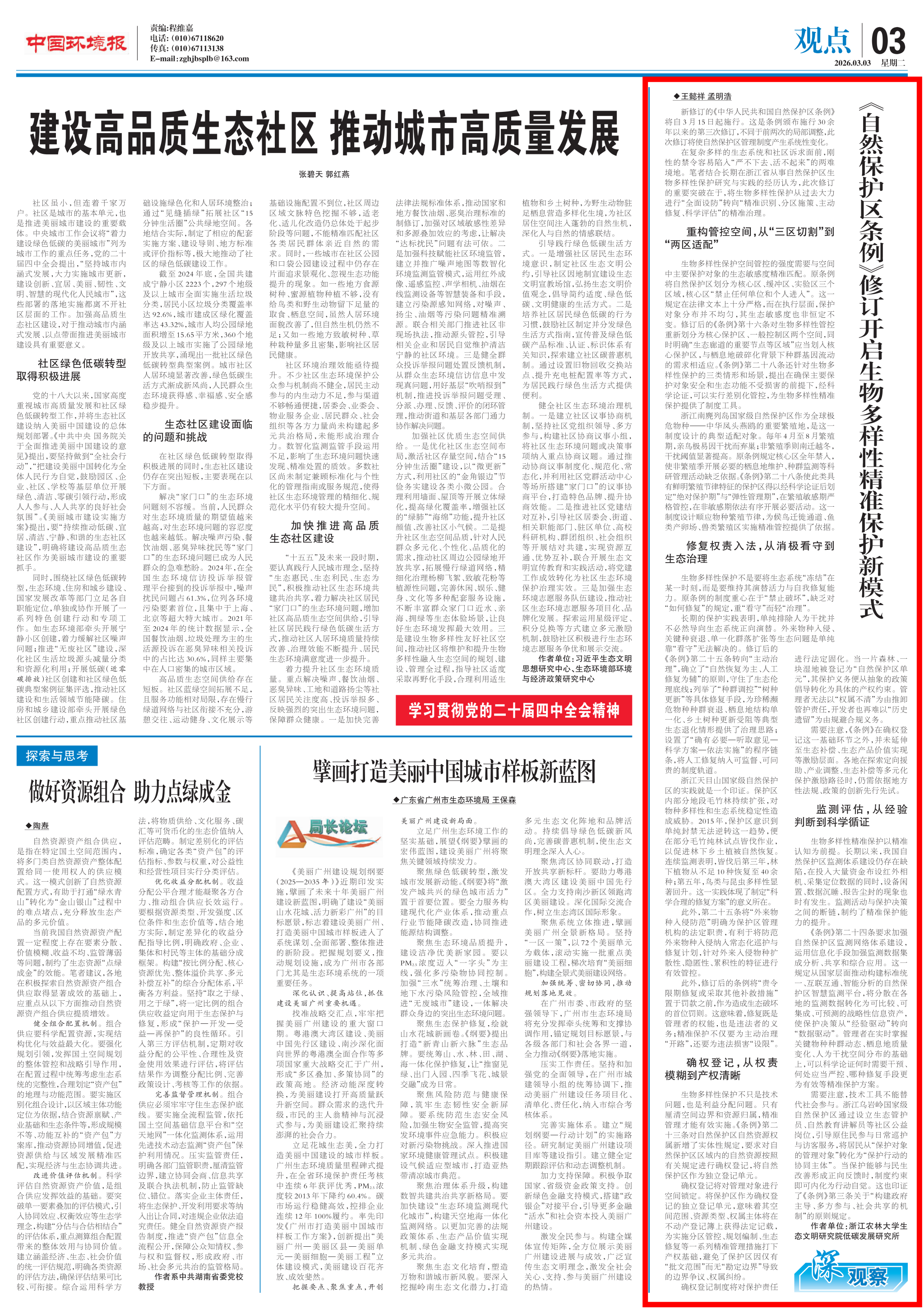 2026年3月3日,浙江省新型重点专业智库——浙江农林大学生态文明研究院低碳发展研究所所长王懿祥教授和研究员孟明浩副教授撰写的理论文章《新修订的《自然保护区条例》有哪些变化?对生物多样性保护会带来哪些影响?》刊发在《中国环境报》上。现将全文转载如下: