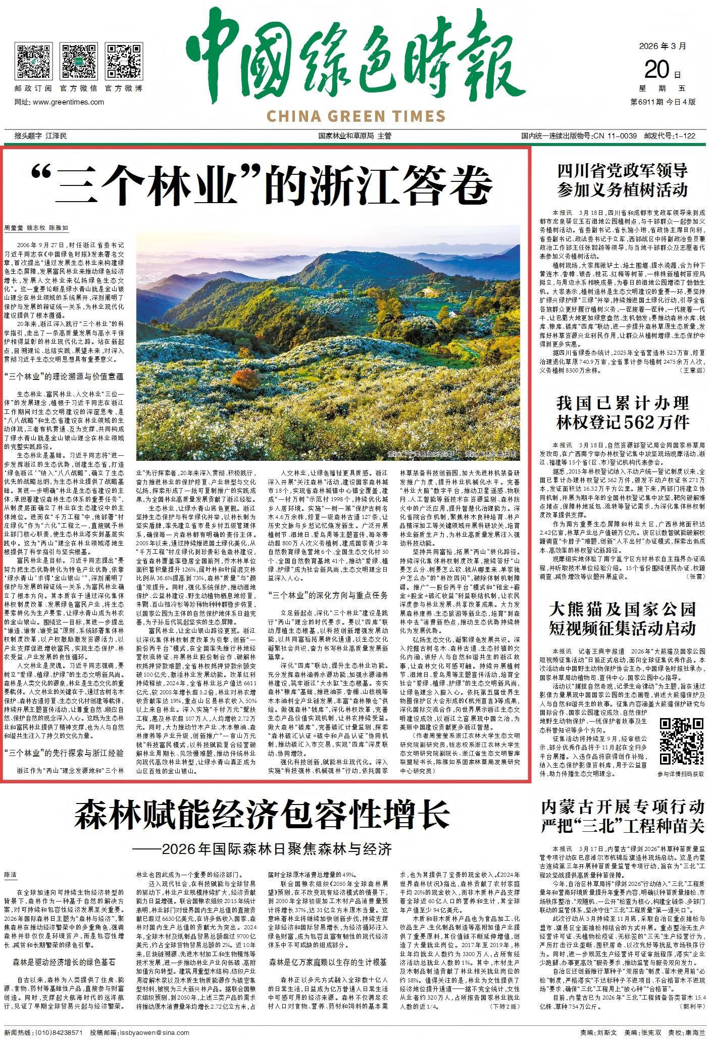 2026年3月20日,浙江省新型重点专业智库——浙江农林大学生态文明研究院副研究员周莹莹和浙江农林大学生态文明研究院常务副院长钱志权教授以及国家林草局发展研究中心研究员陈雅如撰写的理论文章《“三个林业”的浙江答卷》在《中国绿色时报》头版头条上发表。现将全文转载如下: