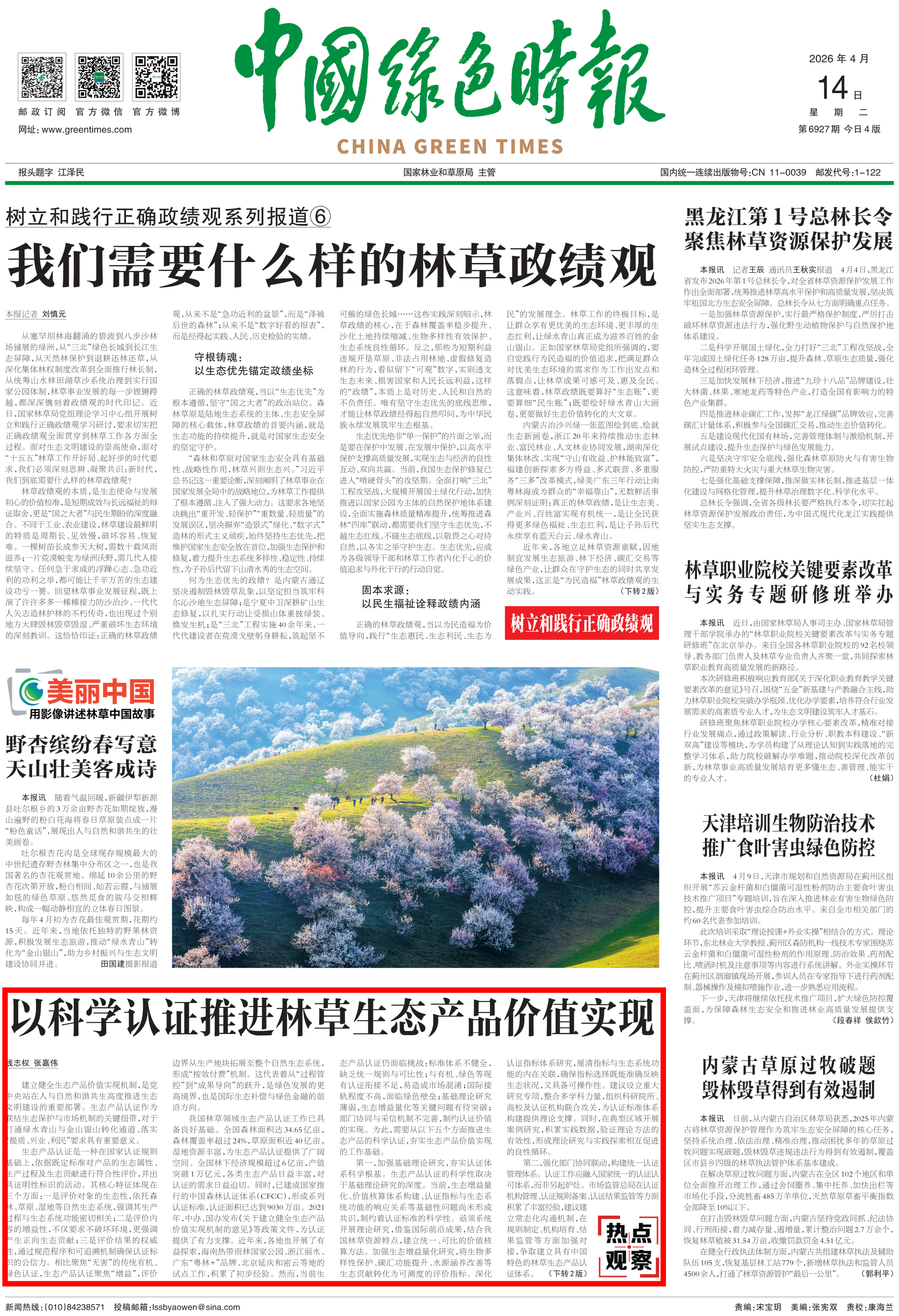 2026年4月14日,由浙江农林大学生态文明研究院常务副院长钱志权教授和国家林草局科技发展中心张嘉伟撰写的理论文章《以科学认证推进林草生态产品价值实现》在《中国绿色时报》上发表。现将全文转载如下: