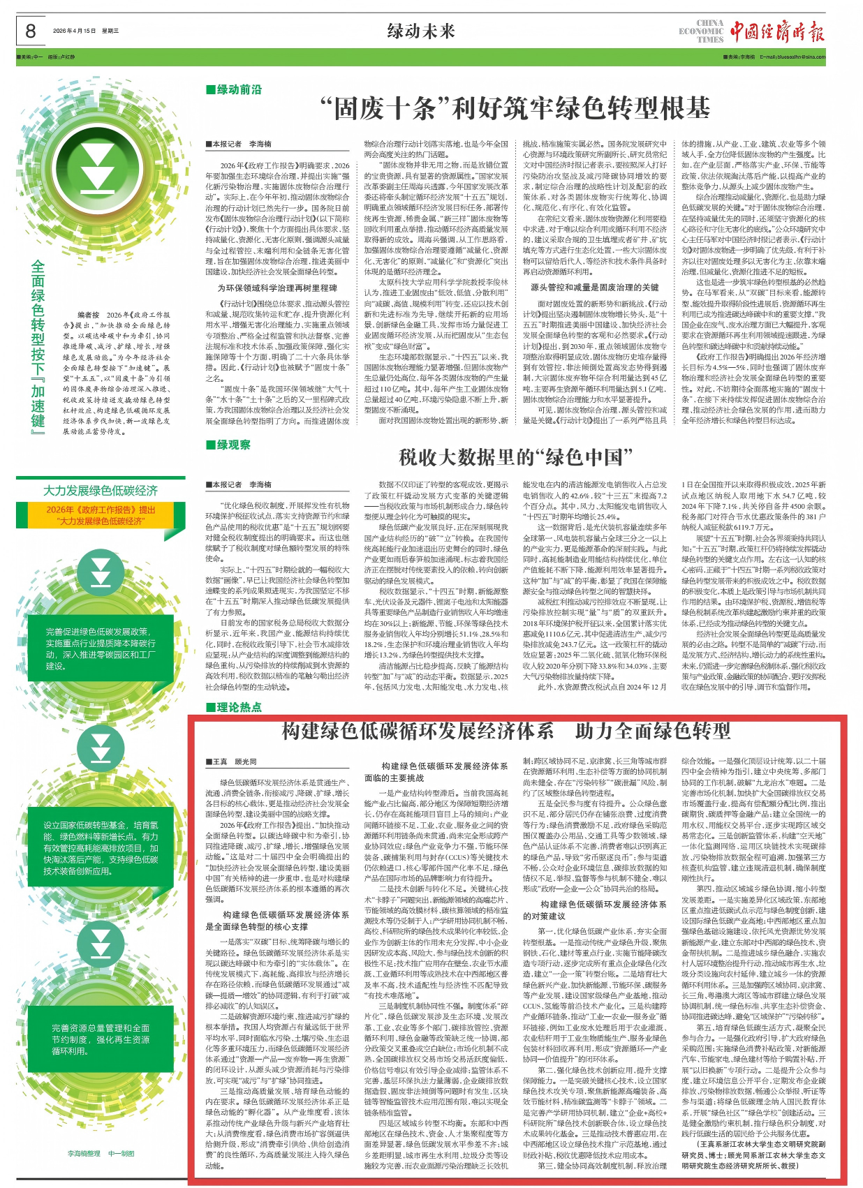 2026年4月16日,由浙江农林大学生态文明研究院副研究员王真和浙江农林大学生态文明研究院生态经济研究所所长顾光同教授撰写的理论文章《构建绿色低碳循环发展经济体系 助力全面绿色转型》在《中国经济时报》上发表。现将全文转载如下: