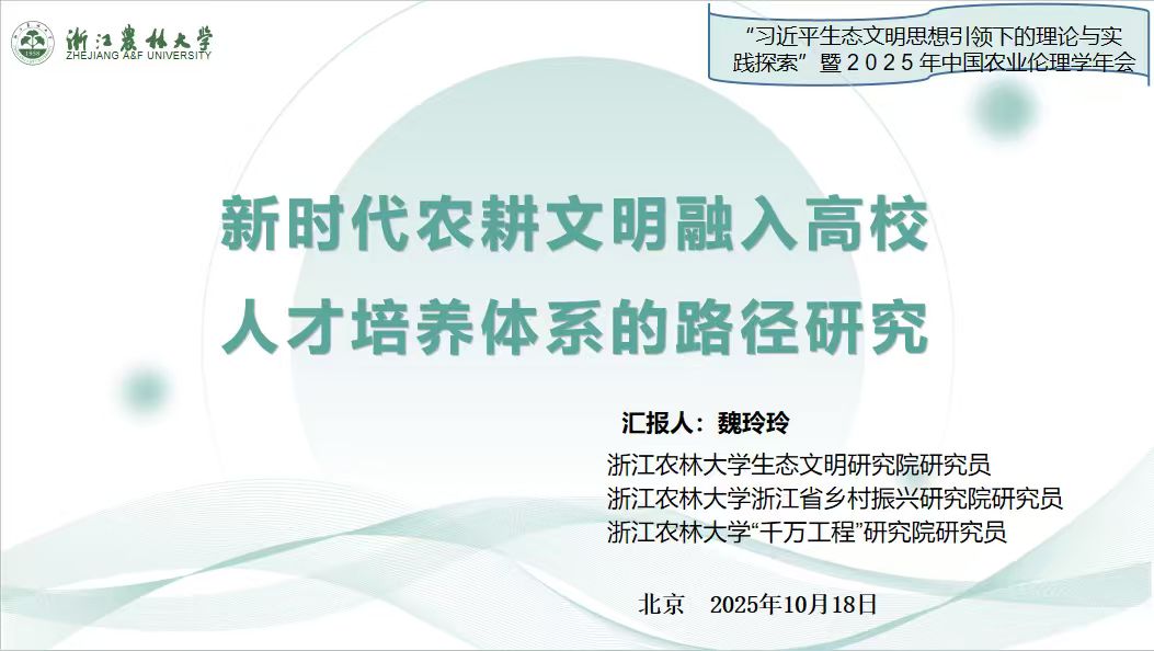 10月17日至19日,“习近平生态文明思想引领下的理论与实践探索”暨2025年中国草学会农业伦理学年会在北京林业大学举办。会议汇聚全国近百名专家学者,围绕农业伦理学与时代命题展开深度对话。浙江农林大学生态文明研究院魏玲玲研究员受邀作“新时代农耕文明如何有效融入人才培养体系”交流报告。