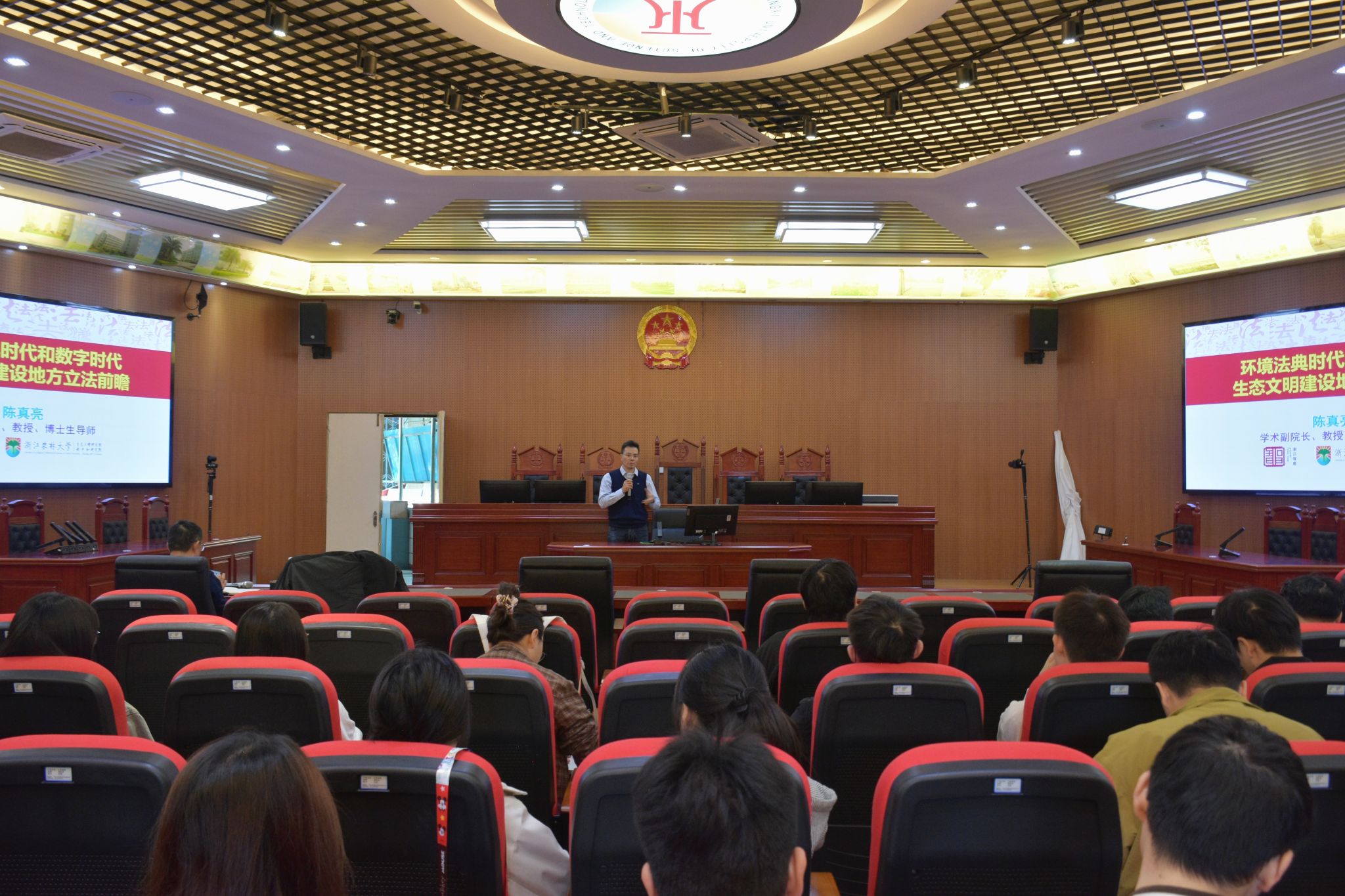 2025年11月17日上午,浙江省新型重点专业智库——浙江农林大学生态文明研究院生态治理研究所所长、博士生导师陈真亮教授做客江西理工大学第31期清江法学讲坛,在红旗校区智慧模拟法庭为法学院师生作题为《环境法典时代和数字时代的生态文明建设地方立法前瞻》的学术讲座。讲座由王世进教授主持,围绕我国生态环境法典编纂进展情况、法典草案第一次和第二次审议稿评析、生态环境法典编纂方法论、数字时代环境法治理范式革新和挑战、环境法法源中的地方立法体系及规范化、地方立法的法典思维贯彻和具体化任务等内容展开。