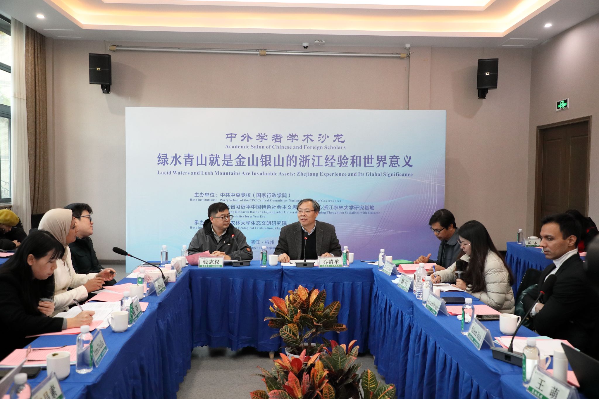 2025年11月19日下午,由中共中央党校(国家行政学院)、浙江省习近平新时代中国特色社会主义思想研究中心浙江农林大学研究基地主办,浙江农林大学生态文明研究院承办的“中外学者学术沙龙”在浙江农林大学衣锦校区天目厅成功举办。