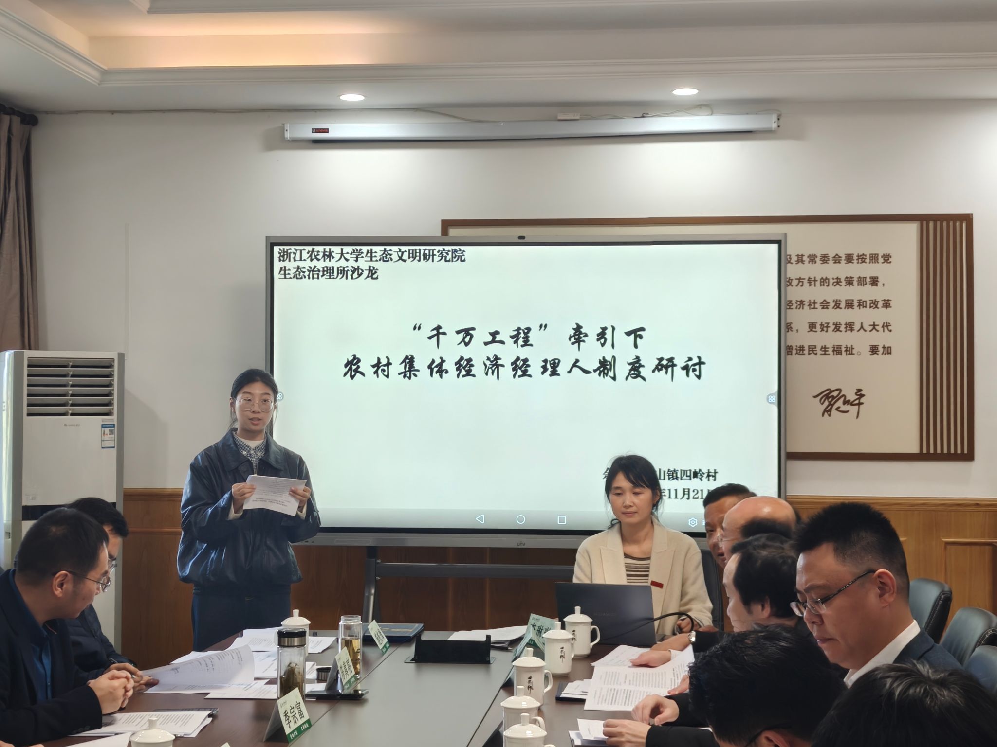 2025年11月21日,浙江农林大学生态文明研究院生态治理研究所所长陈真亮教授带队,赴杭州市余杭区四岭村开展《“千万工程”牵引下农村集体经济经理人制度研讨》学术沙龙。本次学术活动由浙江农林大学生态文明研究院生态治理研究所牵头组织,与会人员包括省农业农村局相关领导、杭州市优秀乡村职业经理人代表及多所高校的专家学者。会议聚焦乡村振兴经理人的培养路径,致力于推动乡村运营工作的规范化与专业化发展。
