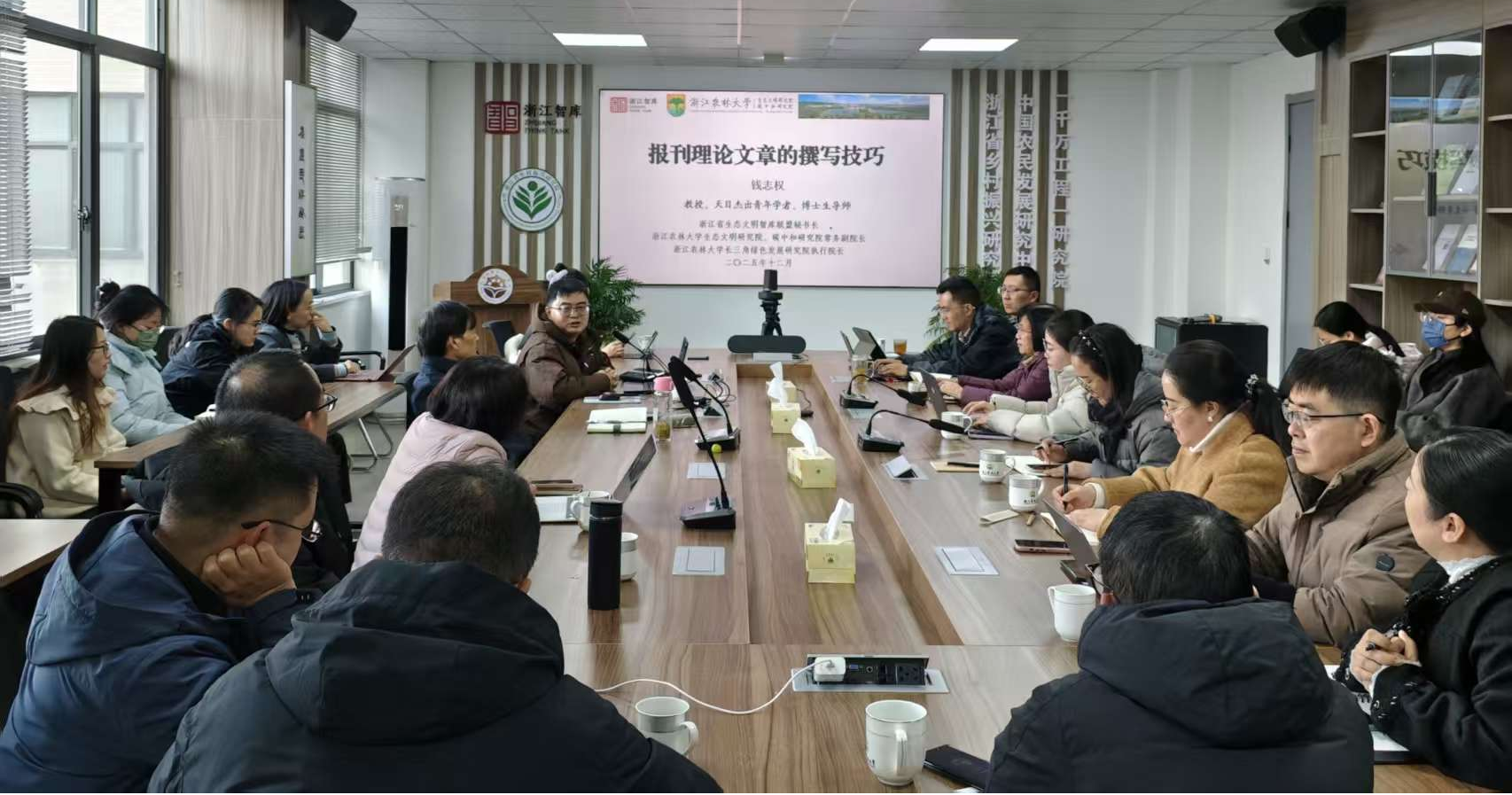 2025年12月26日,由浙江农林大学浙江省乡村振兴研究院与经济管理学院联合主办的“乡村振兴大讲堂”第39期暨“经管学术论坛”第131期在浙江农林大学衣锦校区顺利举行。本次讲堂特邀浙江农林大学生态文明研究院常务副院长钱志权教授担任主讲嘉宾,以“报刊理论文章的撰写技巧”为主题,为与会师生带来了一场兼具理论深度与实践指导的精彩讲座。乡村振兴研究院院长沈月琴教授等40余位师生参会,会议由乡村振兴研究院首席专家、副院长张俊飚教授主持。