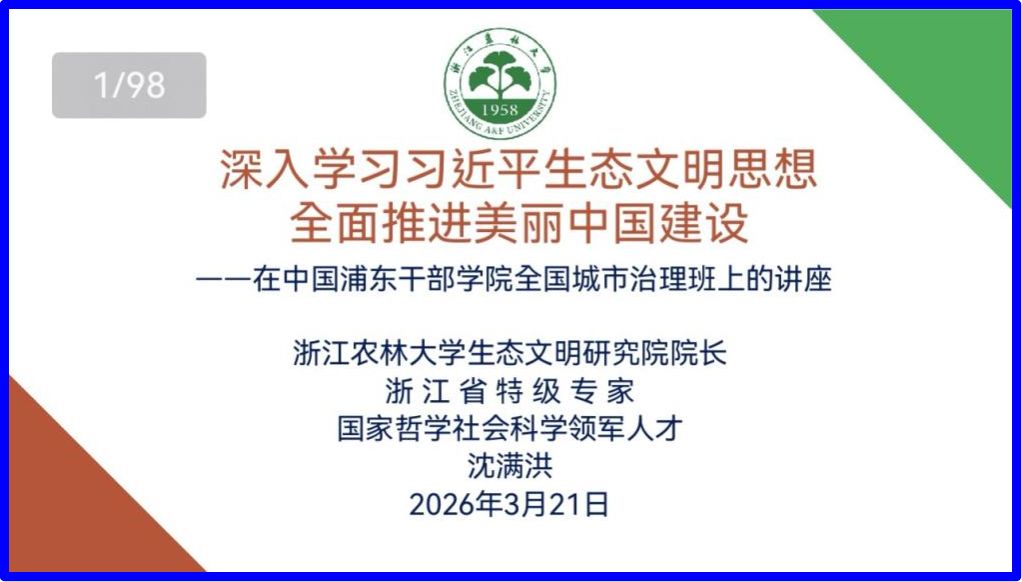 3月下旬,浙江省新型重点专业智库、浙江省全国影响力建设智库——浙江农林大学生态文明研究院院长兼首席专家沈满洪教授两度赴上海宣讲习近平生态文明思想。3月21日下午,沈满洪为中国浦东干部学院来自全国各市分管生态环境和城市建设的副市长构成的城市治理班学员做了题为《深入学习贯彻习近平生态文明思想,全面推进美丽中国建设》的宣讲。3月30日上午,沈满洪为中共上海市委党校来自上海市、北京市、深圳市的中青班学员做了同题宣讲。