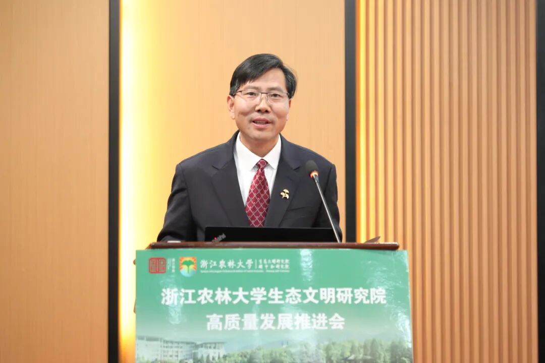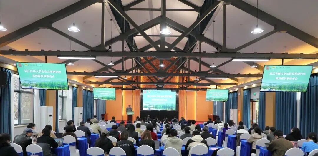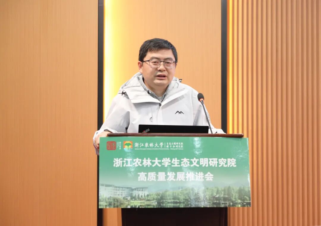 2026年3月31日,浙江农林大学生态文明研究院高质量发展推进会在衣锦校区农林大讲堂隆重召开。浙江农林大学副校长、党委委员宋厚辉,人文社科处副处长蒋挺以及研究院全体人员参与,会议还特邀全球发展学院院长、浙江大学原副校长、国家战略与区域发展研究院院长黄先海教授作专题报告。会议分上下两个阶段,分别由谢慧明副院长、沈满洪院长主持。