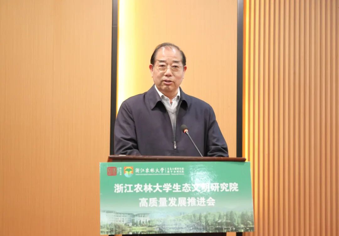 浙江农林大学生态文明研究院常务副院长钱志权教授专题汇报研究院建设成效与2026年工作要点。2025年,研究院成功入选国家AMI智库,连续两年获评全国影响力智库,获国家领导人批示8件、省部级以上批示22件,科研、学术与人才建设均取得明显成效。他指出研究院在成果报送、国际影响力、智库成长力等方面仍存在短板,并围绕五大影响力维度明确2026年发展目标,部署人才建设、内外合作、有组织科研等重点工作。