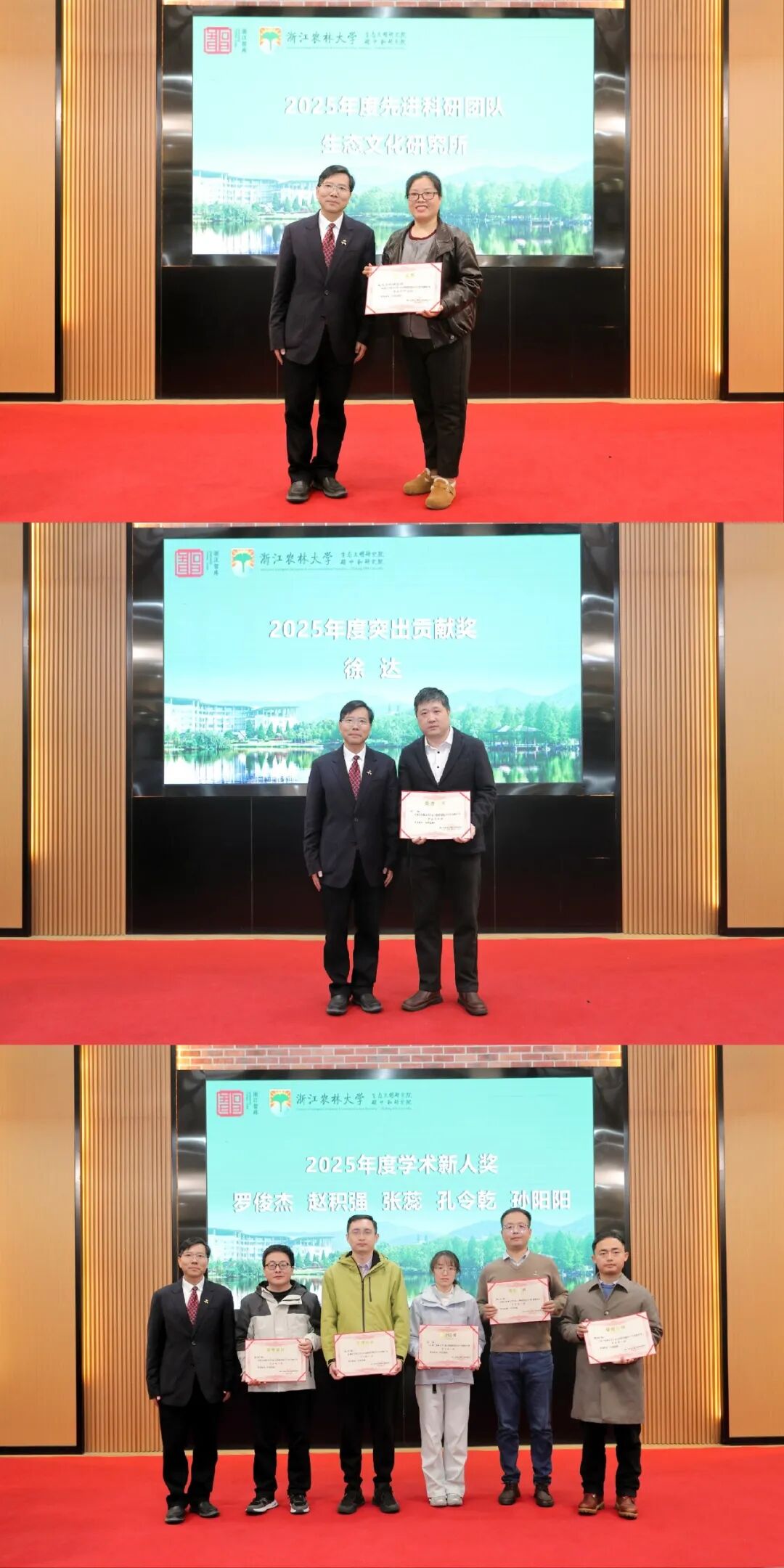 会上还举行了2025年先进集体及个人表彰仪式,生态文化研究所荣获2025年度先进科研团队,徐达获2025年度突出贡献奖,罗俊杰、赵积强、张蕊、孔令乾、孙阳阳获2025年度学术新人奖,与会领导为获奖团队及个人颁奖。徐达、赵积强分别作为先进科研团队和学术新人代表发言。