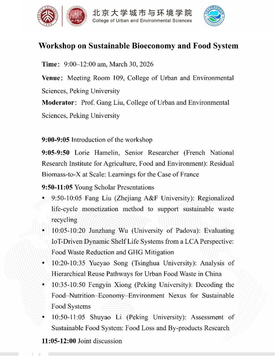 2026年3月30日上午9:00-12:00,“可持续生物经济与食物系统”专题研讨会(Workshop on Sustainable Bioeconomy and Food System)在北京大学城市与环境学院成功召开。研讨会由北京大学刘刚教授主持,来自中外高校、科研院所的专家学者围绕可持续生物经济与食物系统领域的前沿议题展开深度研讨,浙江农林大学生态文明研究院特设教授刘芳受邀参会并作报告。