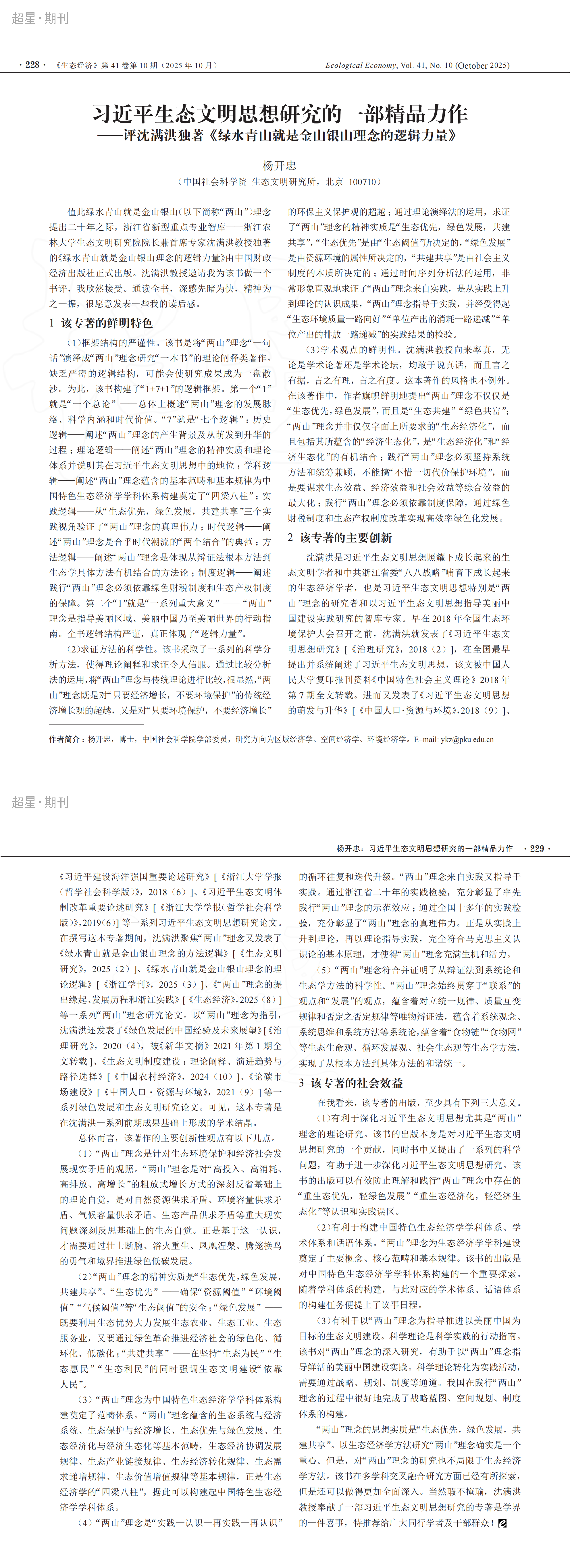 杨开忠教授认为该著作的创新点在于:沈满洪是习近平生态文明思想照耀下成长起来的生态文明学者和中共浙江省委“八八战略”哺育下成长起来的生态经济学者,也是习近平生态文明思想特别是“两山”理念的研究者和以习近平生态文明思想指导美丽中国建设实践研究的智库专家。早在2018年全国生态环境保护大会召开之前,沈满洪就发表了《习近平生态文明思想研究》[《治理研究》,2018(2)],在全国最早提出并系统阐述了习近平生态文明思想,该文被中国人民大学复印报刊资料《中国特色社会主义理论》2018年第7期全文转载。进而又发表了《习近平生态文明思想的萌发与升华》[《中国人口·资源与环境》,2018(9)]、《习近平建设海洋强国重要论述研究》[《浙江大学学报(哲学社会科学版)》,2018(6)]、《习近平生态文明体制改革重要论述研究》[《浙江大学学报(哲学社会科学版)》,2019(6)]等一系列习近平生态文明思想研究论文。在撰写这本专著期间,沈满洪聚焦“两山”理念又发表了《绿水青山就是金山银山理念的方法逻辑》[《生态文明研究》,2025(2)]、《绿水青山就是金山银山理念的理论逻辑》[《浙江学刊》,2025(3)]、《“两山”理念的提出缘起、发展历程和浙江实践》[《生态经济》,2025(8)]等一系列“两山”理念研究论文。以“两山”理念为指引,沈满洪还发表了《绿色发展的中国经验及未来展望》[《治理研究》,2020(4),被《新华文摘》2021年第1期全文转载]、《生态文明制度建设:理论阐释、演进趋势与路径选择》[《中国农村经济》,2024(10)]、《论碳市场建设》[《中国人口·资源与环境》,2021(9)]等一系列绿色发展和生态文明研究论文。可见,这本专著是在沈满洪一系列前期成果基础上形成的学术结晶。