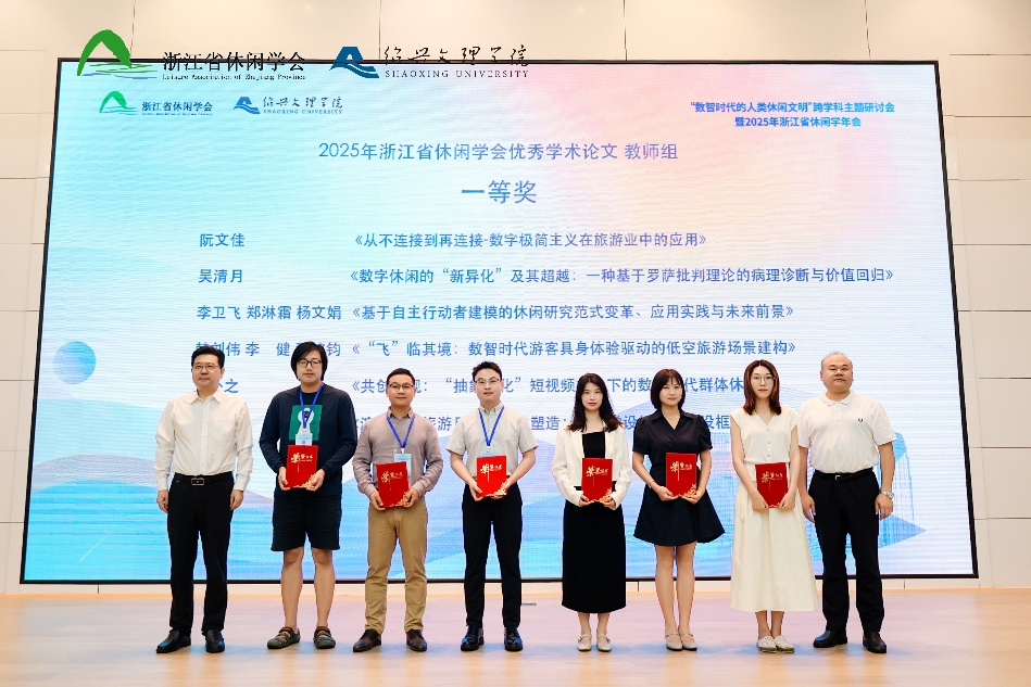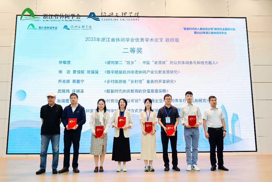 开幕式仪式上,李健教授主持了颁奖环节,对优秀的教师论文与学生论文以及休闲文旅创新与休闲教育创新案例做出表彰。徐达研究员担任平行论坛三“数智时代与休闲方式变迁”主持人。本次年会也是浙江省主办方共收到158篇论文和案例成果。经过评审组严格评审,韩刘伟老师《“飞”临其境:数智时代游客具身体验驱动的低空游场景建构》、徐达研究员《数字赋能杭州非遗休闲产业创新发展研究》论文分别获得“2025年浙江省休闲学会优秀学术论文”(教师组)一等奖和二等奖。