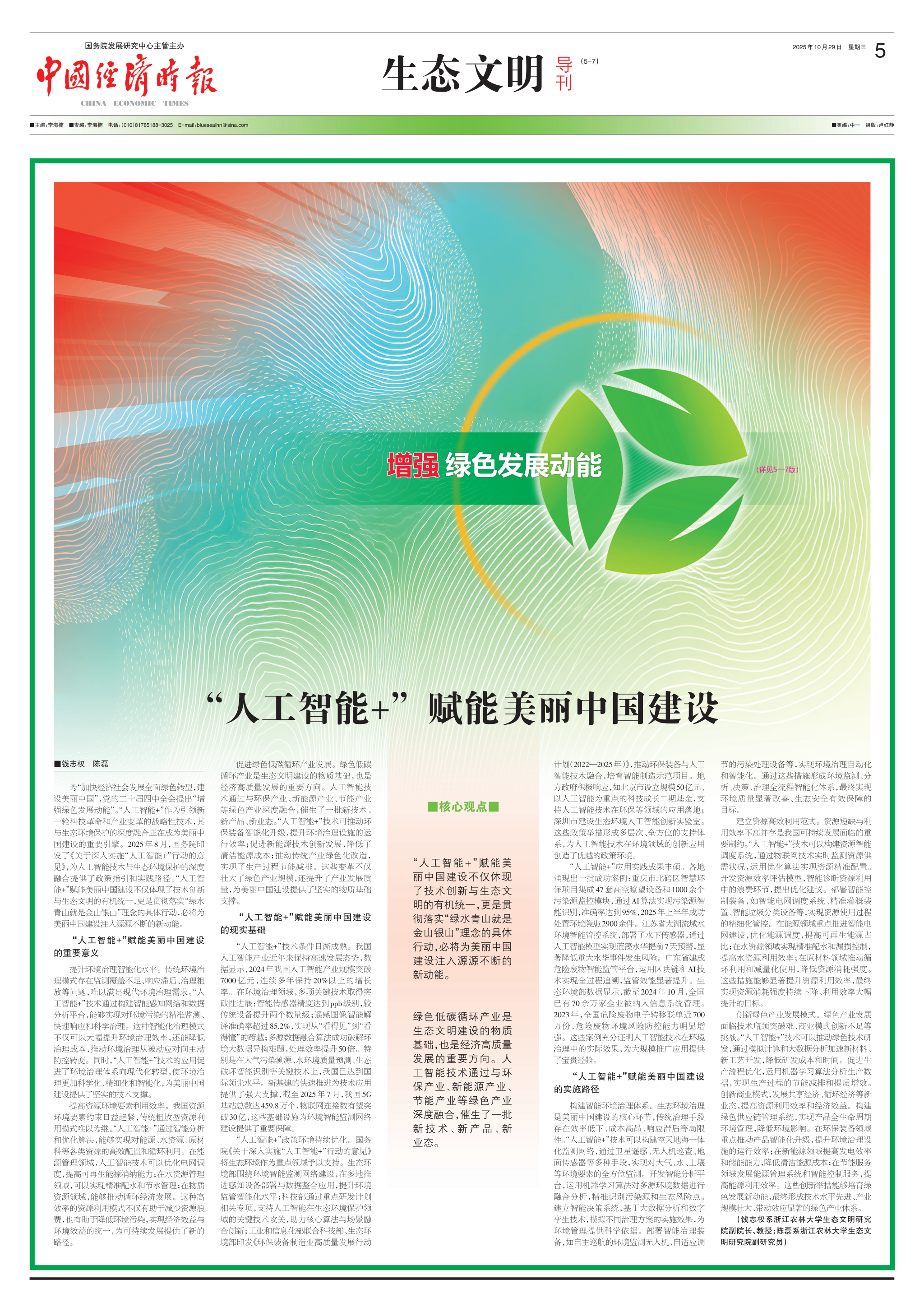 近日,由浙江农林大学生态文明研究院副院长钱志权与副研究员陈磊合作撰写的理论文章《“人工智能+”赋能美丽中国建设》,作为深入学习宣传贯彻党的二十届四中全会精神的系列成果之一,于10月29日在《中国经济时报》生态文明导刊“增强绿色发展动能”专栏头条整版刊发。