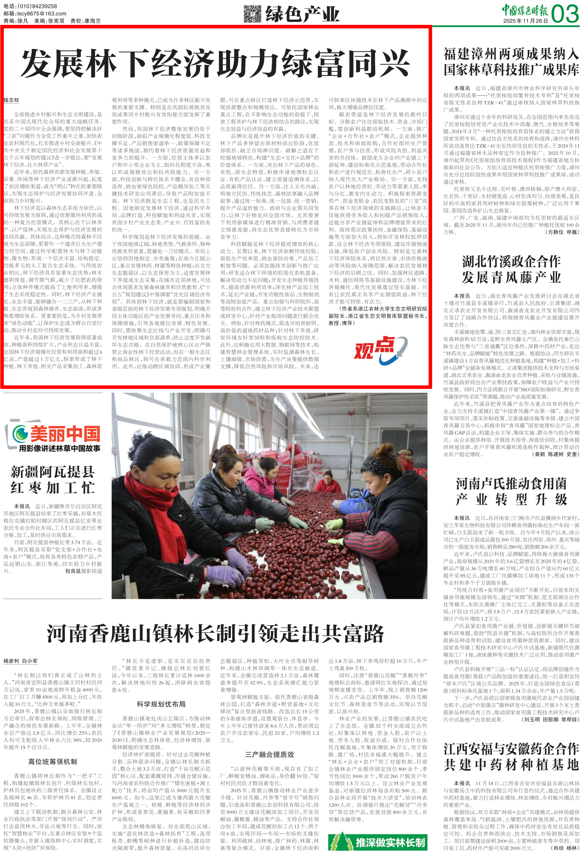 2025年11月26日,浙江农林大学生态文明研究院副院长钱志权教授撰写的理论文章发展林下经济助力绿富同兴发表在《中国绿色时报》上。该文章是生态文明研究院深入学习贯彻党的二十届四中全会精神的理论成果。现将全文转载如下:
