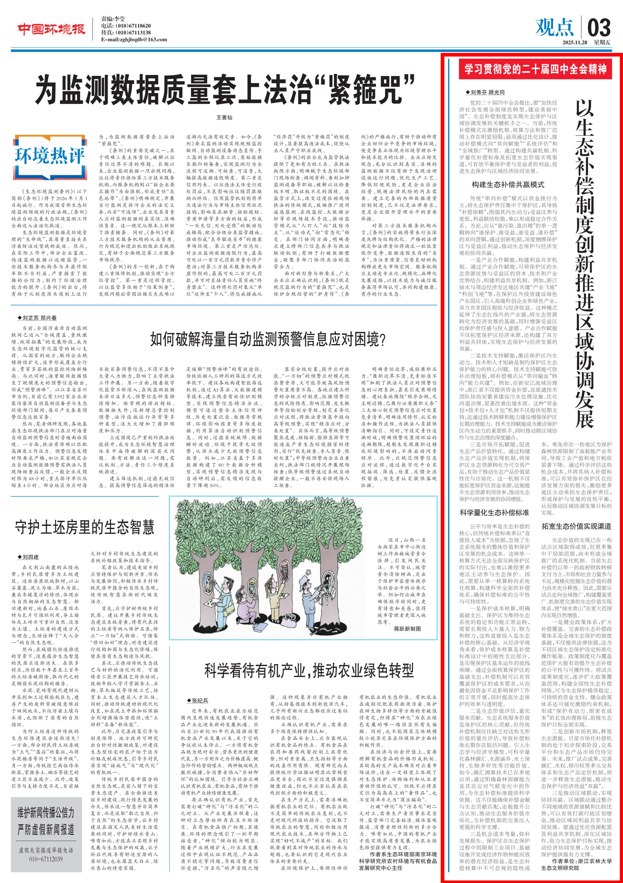 2025年11月28日,浙江农林大学生态文明研究院生态经济研究所副研究员刘秀芬与浙江农林大学生态文明研究院生态经济研究所所长顾光同教授撰写的理论文章《以生态补偿制度创新推进区域协调发展》发表在《中国环境报》上。该文章是生态文明研究院深入学习贯彻党的二十届四中全会精神的理论成果。现将全文转载如下: