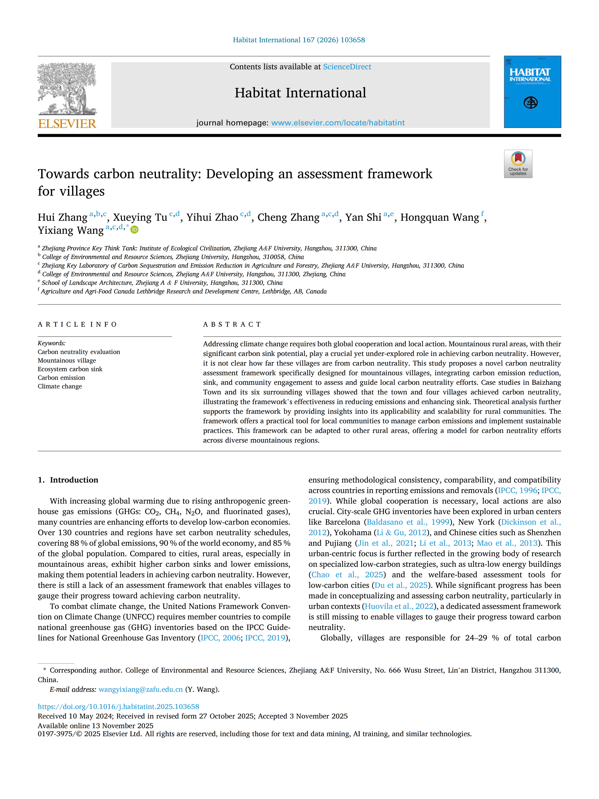 2025 年11月30日,浙江农林大学王懿祥教授团队在中科院一区 TOP 期刊《Habitat International》发表题为《迈向碳中和:构建乡村评估框架》的研究成果。该团队针对山区农村碳汇潜力未被充分发掘、碳中和差距不明确的问题,专门设计了整合碳减排、碳汇及社区参与三大维度的新型碳中和评估框架,并以浙江杭州百丈镇及周边六村为案例开展研究,验证了框架的有效性与适用性,为农村碳中和实践提供了实用工具与推广范本。