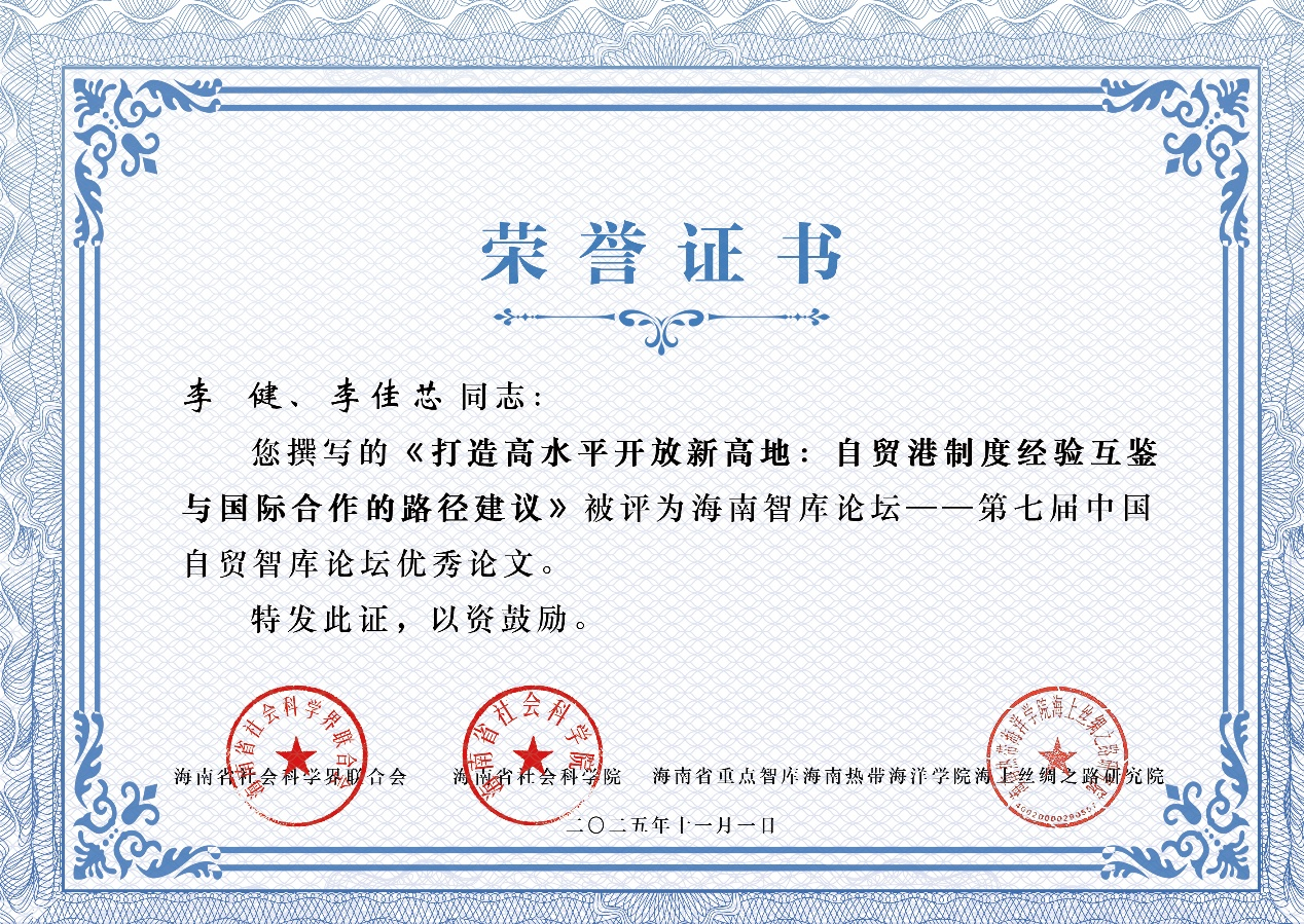 日前,第七届中国自贸智库论坛在海南省三亚市崖州湾科技城举行。来自全国多个自贸试验区的专家学者、政府代表及企业代表围绕“自贸区(港)发展新路径”“海洋经济高质量发展”等议题展开深入研讨。海南智库论坛一第七届中国自贸智库论坛由海南省社会科学界联合会、海南省社会科学院、中国政策科学研究会和海南省旅琼哲学社会科学家联合会等单位共同主办,由海南热带海洋学院承办。本届论坛主题为“深化自贸区(港)战略,打造新时代对外开放重要门户”。李健教授、博士生李佳芯提交的《打造高水平开放新高地:自贸港制度经验互鉴与国际合作的路径建议》(以下简称为《打造高水平开放新高地》)被评委海南智库论坛——第七届中国自贸智库论坛优秀论文。