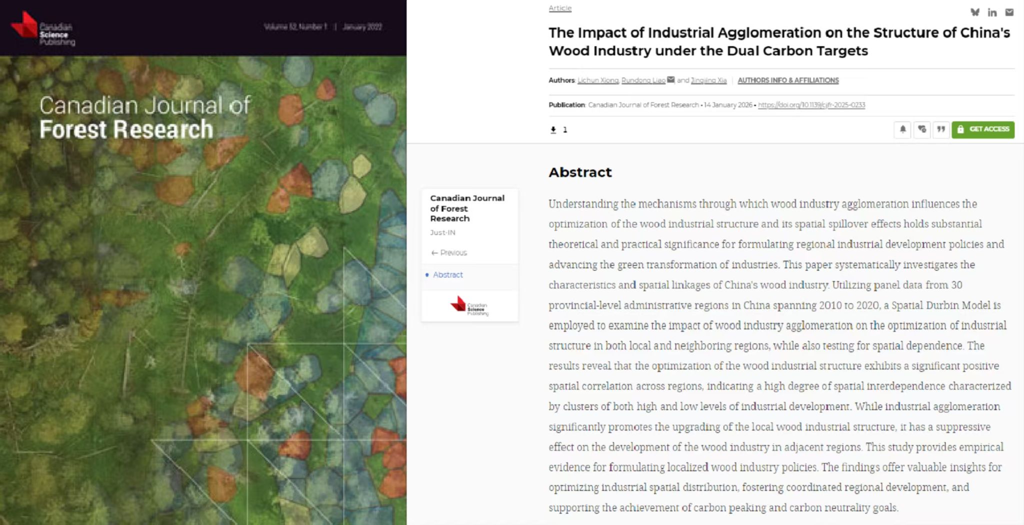 2.以第一作者身份在《Canadian Journal of Forest Research》上发表题为“The Impact of Industrial Agglomeration on the Structure of China's Wood Industry under the Dual Carbon Targets”的研究论文。