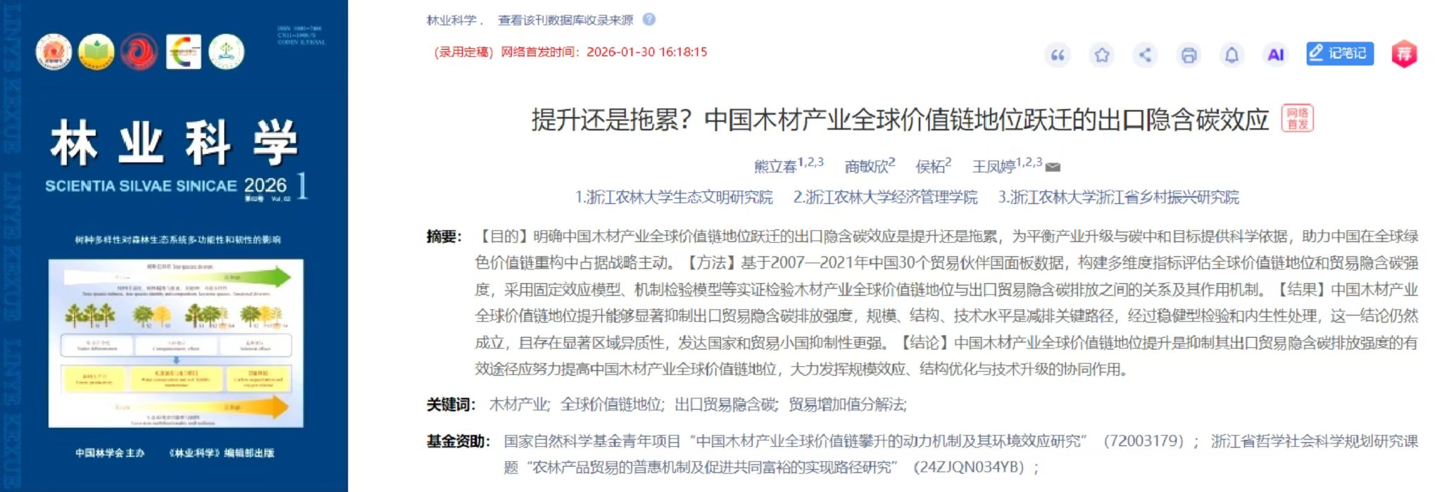 1.以第一作者身份在《林业科学》上发表题为“提升还是拖累?中国木材产业全球价值链地位跃迁的出口隐含碳效应”的研究论文。