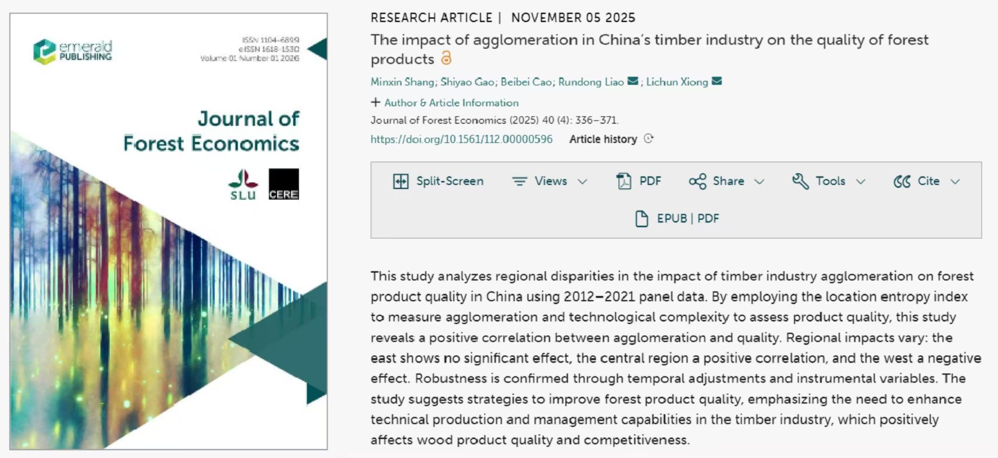 3. 以通讯作者身份在《Journal of Forest Economics》上发表题为“The impact of agglomeration in China's timber industry on the quality of forest products”的研究论文。