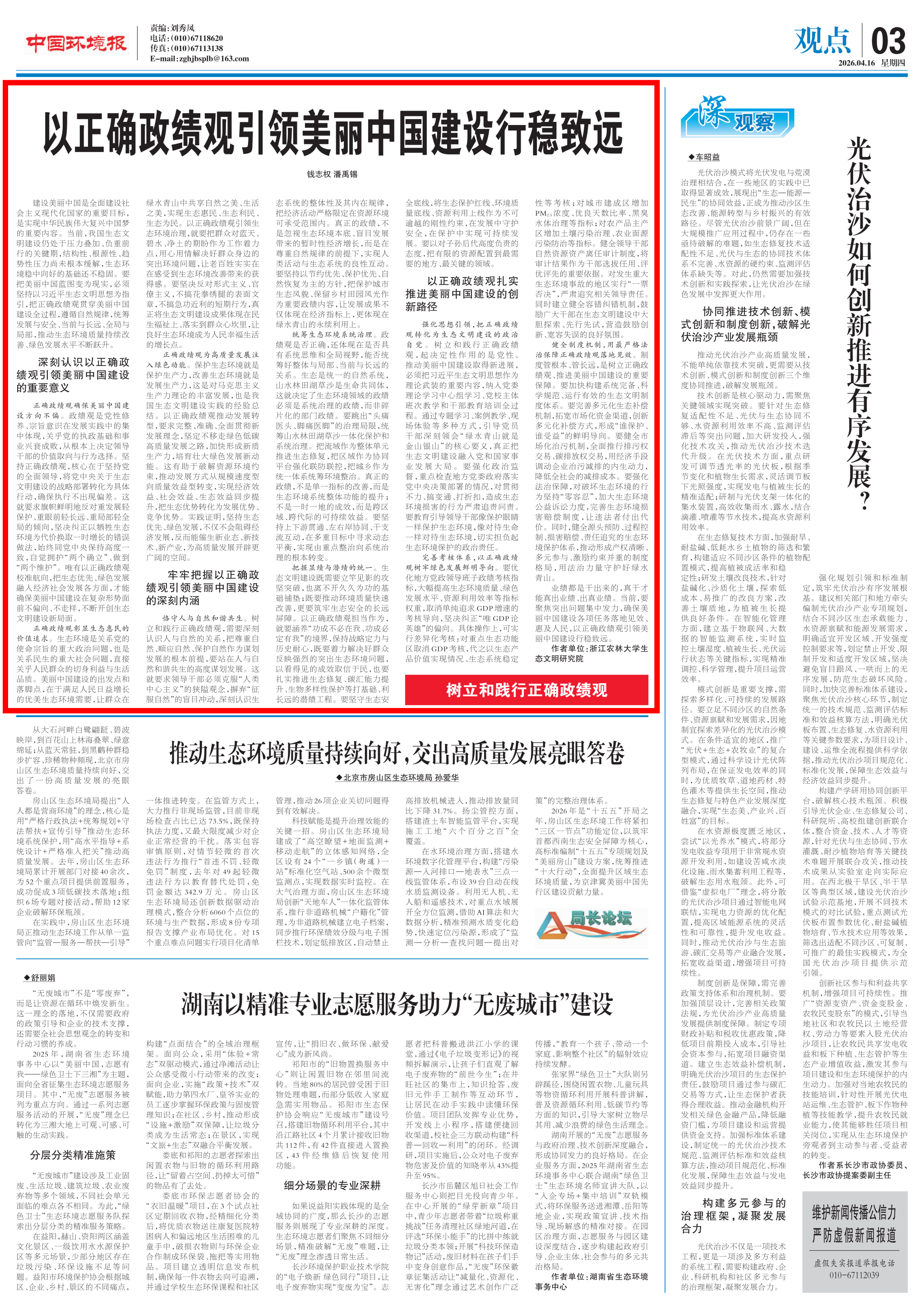 2026年4月16日,由浙江农林大学生态文明研究院常务副院长钱志权教授和生态文明研究院特设副教授潘禹锡合作撰写的《以正确政绩观引领美丽中国建设行稳致远》理论文章在《中国环境报》第3版头条发表。现将全文转载如下:
