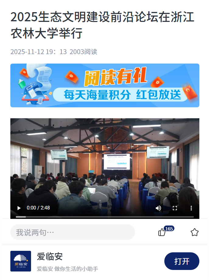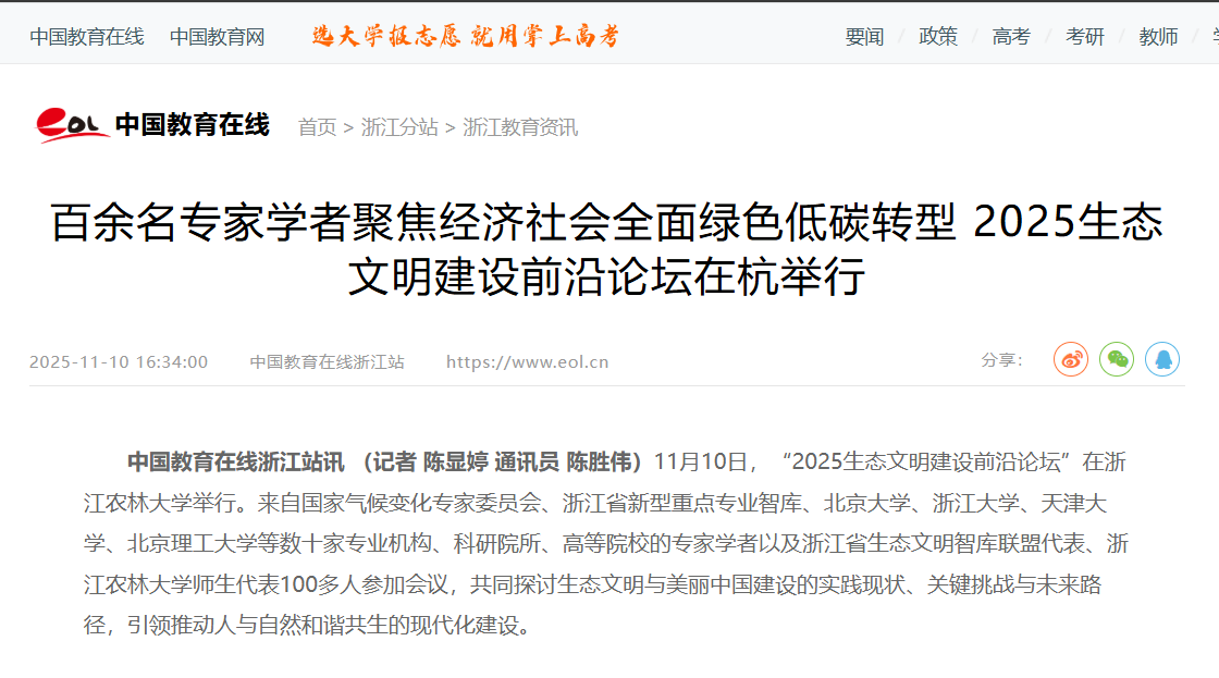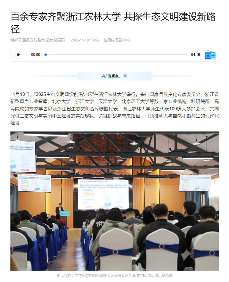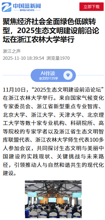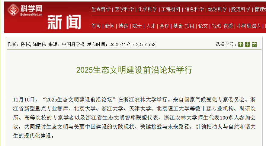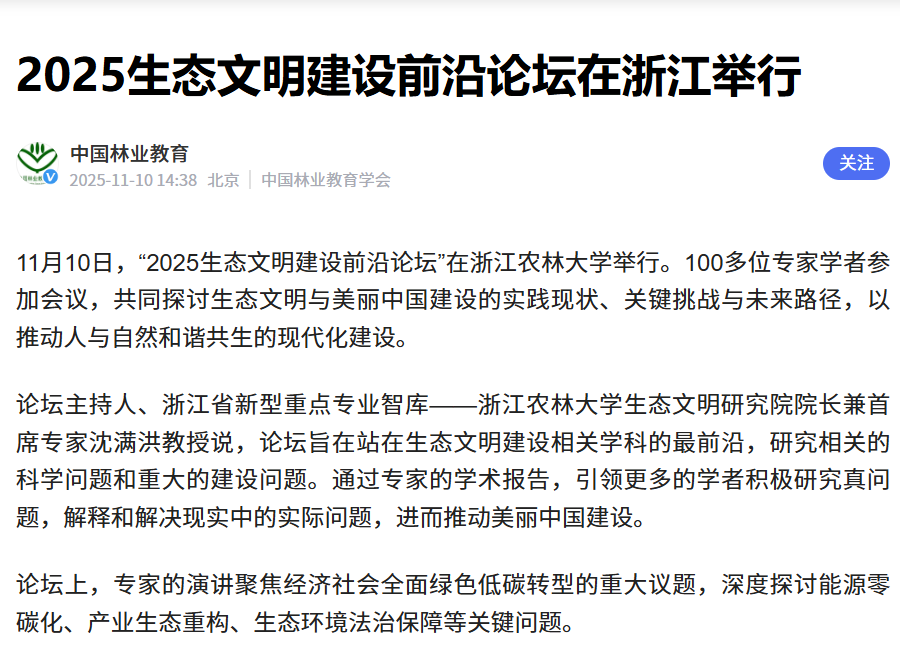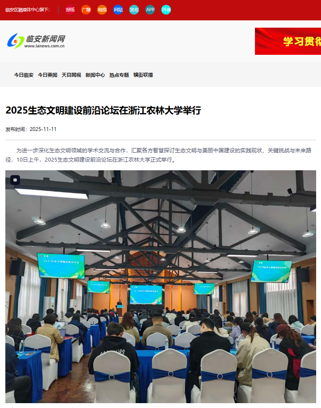 11月10日,由浙江省生态文明智库联盟与浙江省新型重点专业智库——浙江农林大学生态文明研究院共同主办的2025生态文明建设前沿论坛线下共有100多人参会。此次会议得到了中国蓝新闻、中国科学网、中国教育在线、中国林业教育、潮新闻、北京日报、临安新闻网,爱临安等媒体报道。