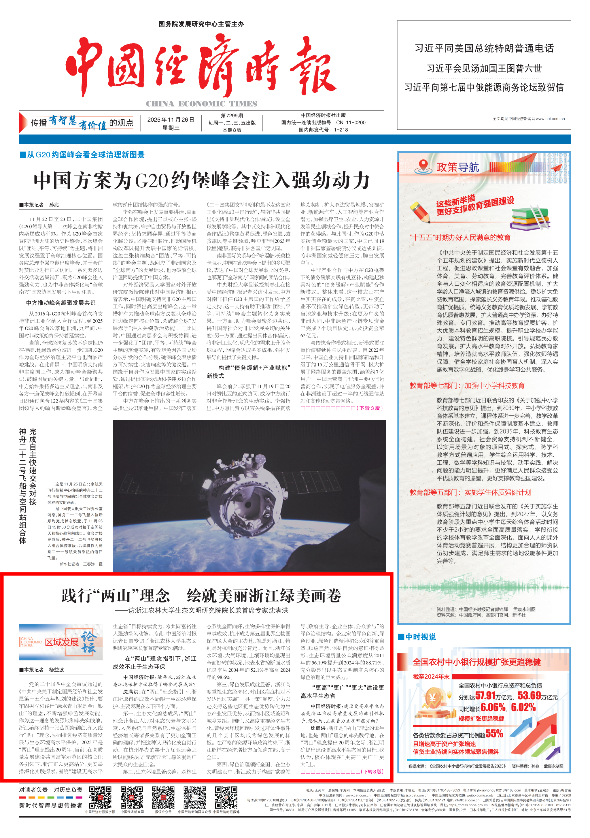 11月26日,浙江农林大学生态文明研究院院长兼首席专家沈满洪教授就“绿水青山就是金山银山”理念的浙江实践接受《中国经济时报》专访,该专访于报纸头版刊登。