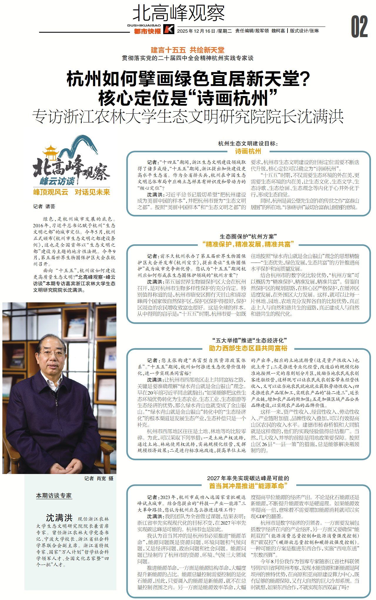 2025年12月15日,围绕 “十五五” 期间杭州如何建设更高质量生态文明、擘画绿色宜居新天堂这一核心议题,浙江农林大学生态文明研究院院长沈满洪教授接受“北高峰观察·峰云访谈”的专访,深入解读杭州生态文明建设的核心定位、生态圈保护 “杭州方案” 及生态优势价值转化路径等关键内容。
