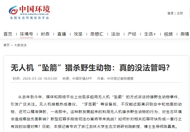 3月26日,浙江农林大学生态文明研究院生态治理研究所所长陈真亮教授在接受《中国环境报》专访时,就无人机“坠箭”非法狩猎野生动物相关问题发表看法。