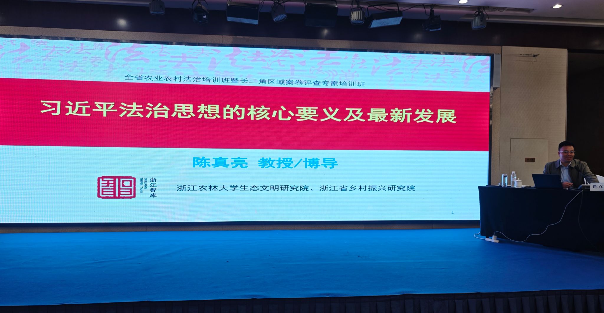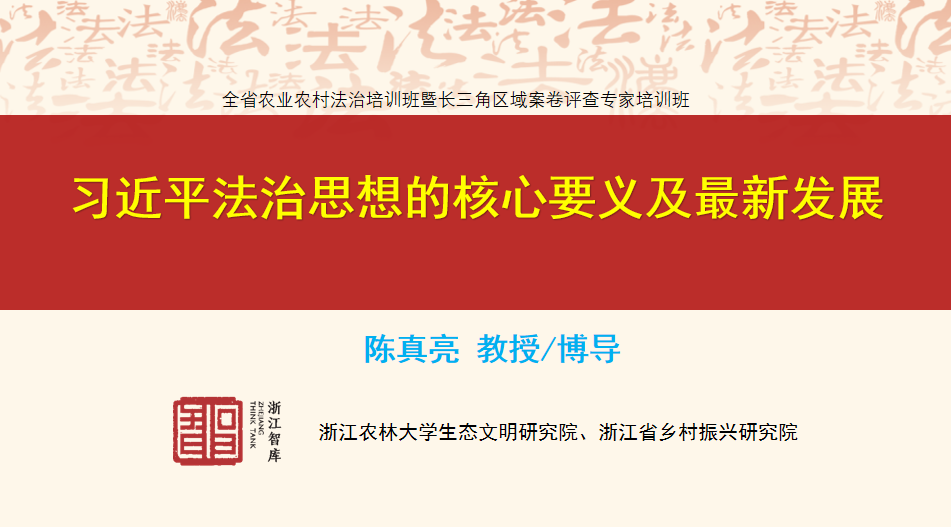 2026年4月21日上午,浙江省全国影响力建设智库、浙江省新型重点专业智库——浙江农林大学生态文明研究院生态治理研究所所长陈真亮教授应邀为全省农业农村法治培训班暨长三角区域案卷评查专家培训班做题为“习近平法治思想的核心要义及最新发展”的专题授课。该期培训班由浙江省农业农村厅组织举办,全省各市、县(市、区)农业农村局法制处(科)负责人,以及上海市、江苏省、安徽省农业执法案卷评查专家等共140余人参加本次培训。